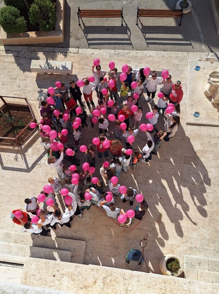 nastavnicima slikali s ružičastim balonima u obliku simbolične vrpce i srca, ispred svoje osnovne