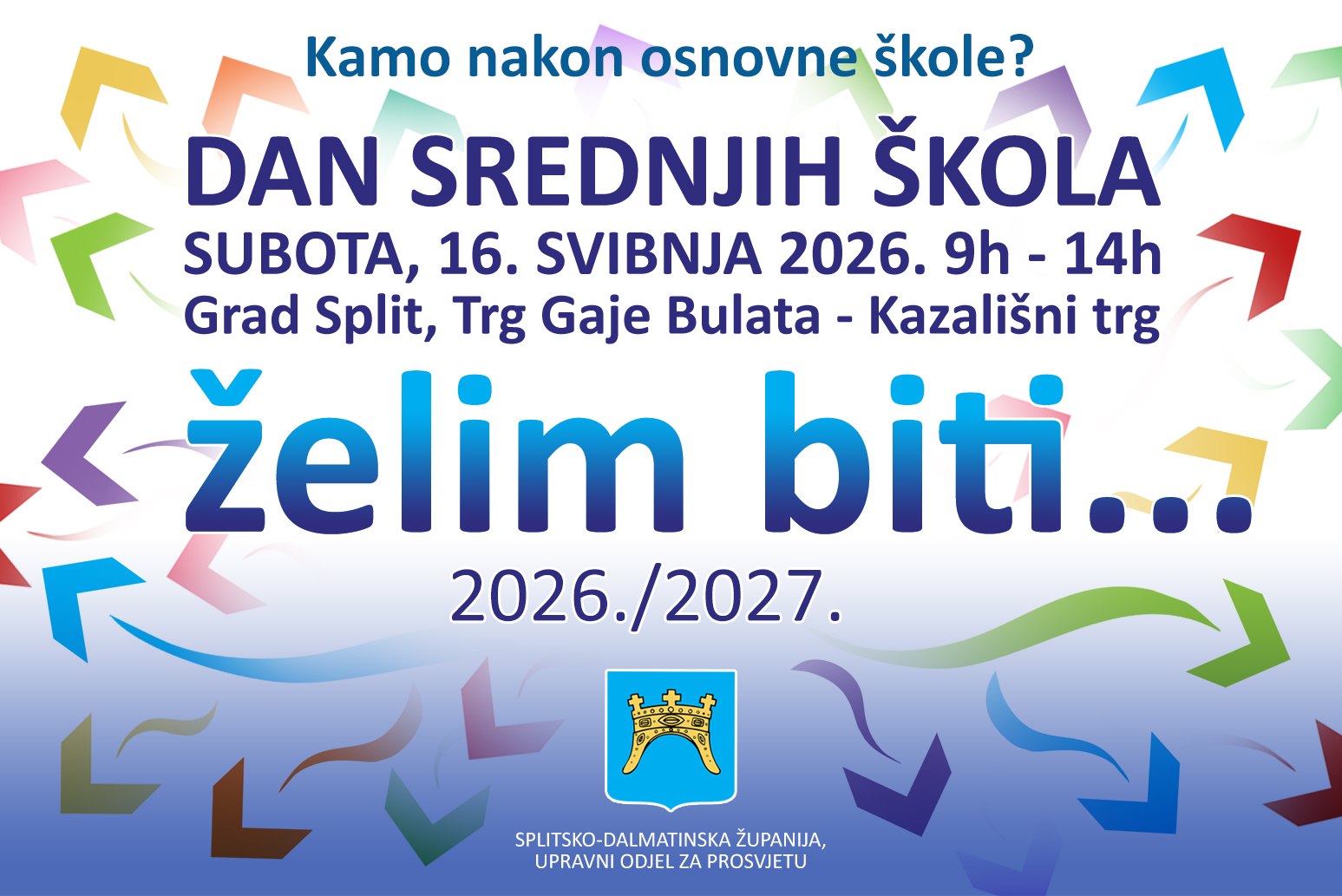 Manifestacija “Dan srednjih škola Splitsko dalmatinske županije” će se održati u subotu, 16. svibnja 2026. od 9:00 do 14:00 sati na prostoru Kazališnog trga – Trga Gaje Bulata, na platou ispred zgrade Hrvatskog narodnog kazališta u Splitu.